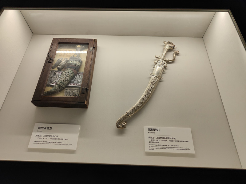 也门馆捐赠的嘉比亚弯刀,又称也门双刃弯刀,是阿拉伯成年男子佩戴在腰间的。刀在鞘中,雕银纹饰,很有异国风情,首先肯定是装饰作用,但既开双刃,想来也能用作武器。斯里兰卡馆的喀斯坦刀是斯里兰卡国刀,刀鞘装饰精美,通身都雕刻纹饰,斯里兰卡的国旗中心图案就是握刀雄狮。