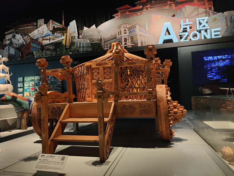蒙古馆的智慧锁——车上的蒙古包真的很有意思,虽然木头材质本身并不是很抢眼,却非常形象地反映了蒙古这个游牧民族国家的迁徙特性。这是蒙古最杰出的拼搭设计师设计的,由两万余片木块构成,在蒙古馆内由工匠耗时三天才将其拼搭完成的。