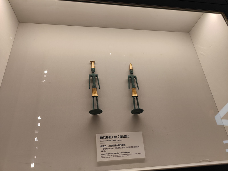 黎巴嫩馆的腓尼基铜人像是一件复制品,铜像是一对的,看不出性别,但是帽子的形状不一样,一个是圆顶,一个是尖顶。帕里子与裙子是黄铜色,其他部分包括底坐都是墨绿色。非尼基文明早在公元前两千多年就出现了,相传他们非常善于航海。