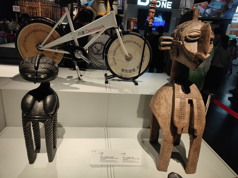 在展厅中,还有许多特色展品和互动体验让人印象深刻。比如,几内亚馆的宁巴、丹麦馆的自行车、也门馆的嘉比亚弯刀等,都以其独特的造型和深厚的文化内涵吸引了众多游客的目光。