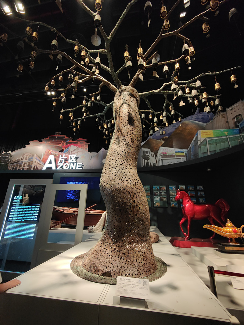 韩国馆捐赠的“金兰之交”铜钱树真的是一棵缀满了铜钱的树,树干粗壮,由一枚枚外圆内方的铜钱串起来,顶部枝叶开展,枝条上挂满了铃挡。