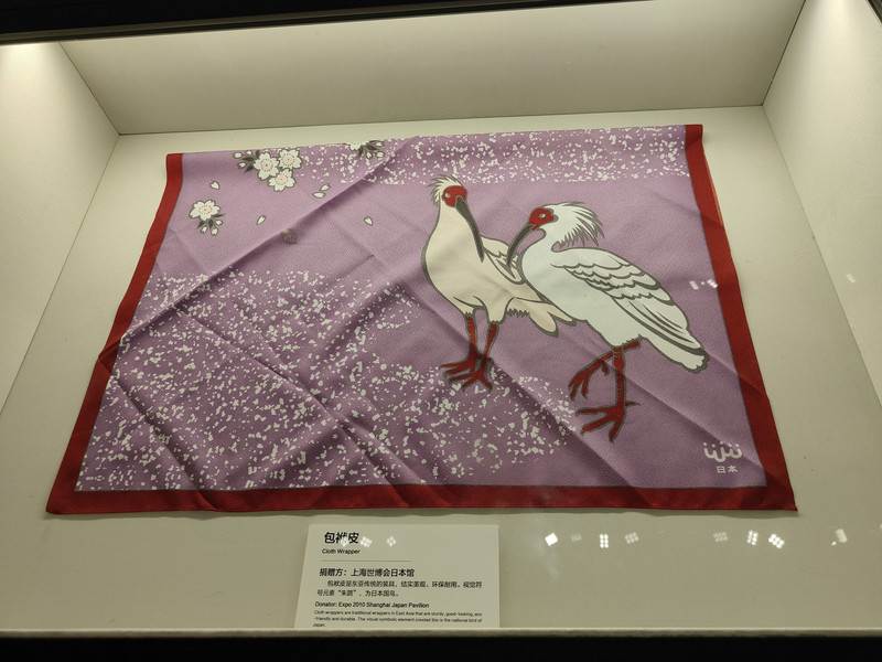 日本馆的包袱皮看着有点敷衍,难道这就是日本拿得出手的特产?包袱皮中国又不是没有,东亚国家传统的装具。包袱皮上的朱鹮难道不是我国的珍稀保护动物吗?不过据说这是日本的国鸟。