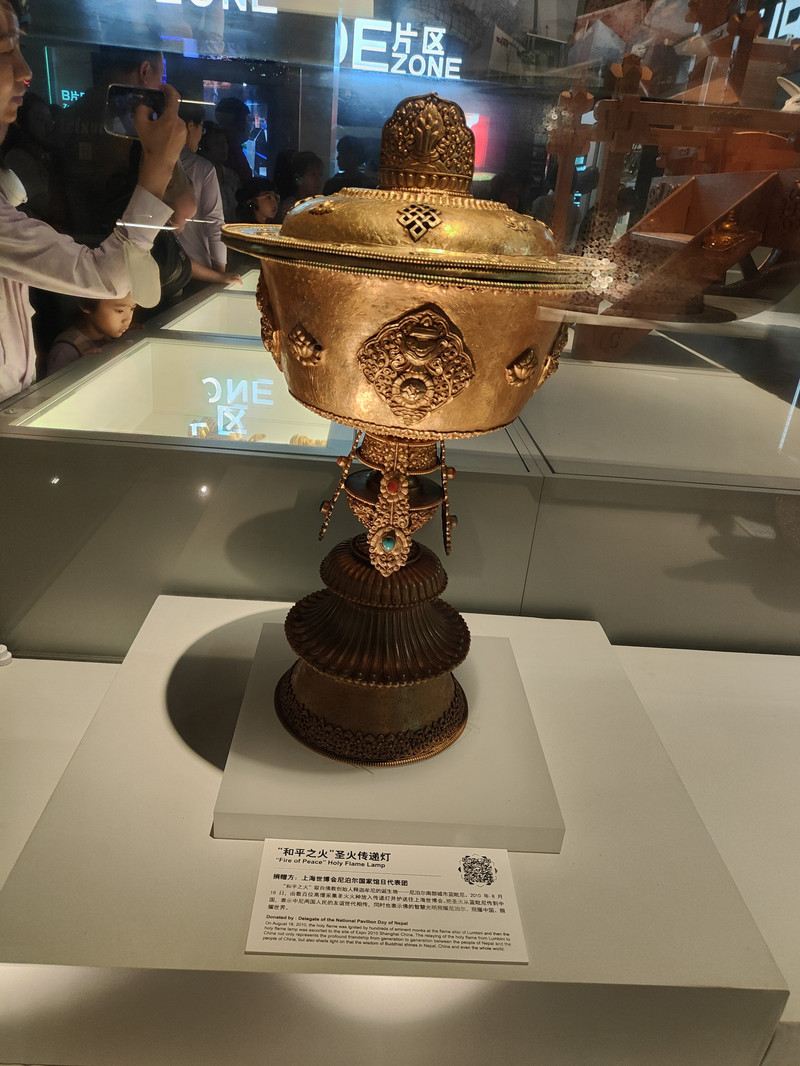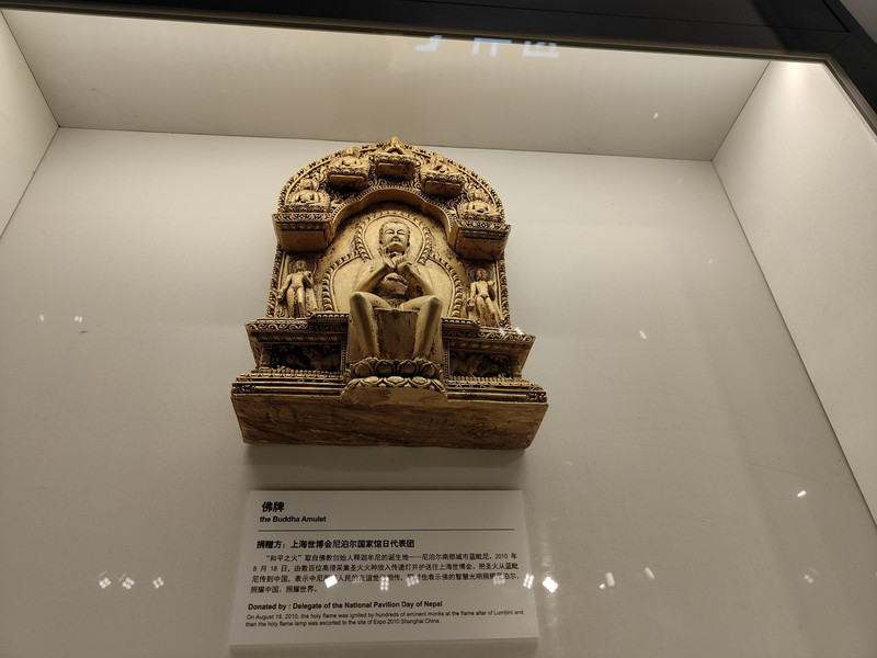 尼泊尔馆的另一件赠品是佛牌,这也是一件不可多得的艺术品,正中是指像是释迦牟尼,他的两侧和上方,还雕塑了七尊佛像。不过佛牌的说明牌上不知道为什么写的是“和平之火”圣灯的说明。
