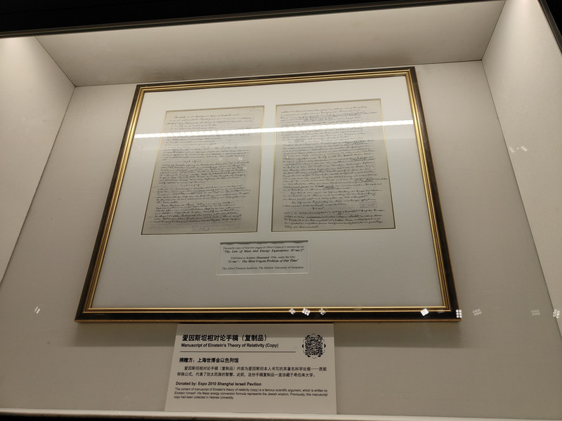 以色列馆捐赠的是爱因斯坦相对论手稿的复制品,内容是爱因斯坦书写的其著名科学论据——质能转换公式。虽然是复制品,但也是很珍贵的文物,以前这份复制品一直珍藏于希伯来大学。