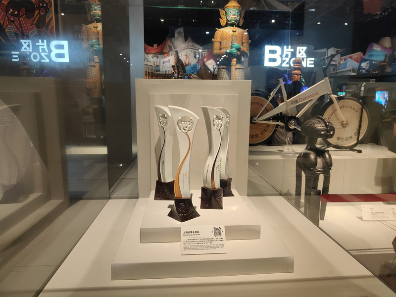 上海世博会奖杯分别颁给了34个各具风情的殿馆,奖项分为展馆设计奖、创意展示奖和主题演绎奖等三种,根据展馆大小分为A、B、C、D四类展馆和金、银、铜三个等次。