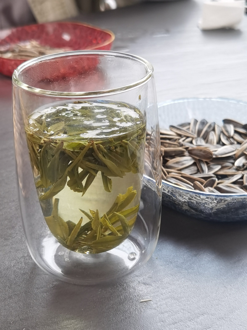 - 茶杯的设计也很贴心,大玻璃杯中间有个小玻璃杯,既方便泡茶又不怕烫手。龙井茶苦中微甘,清香扑鼻,真是让人回味无穷。