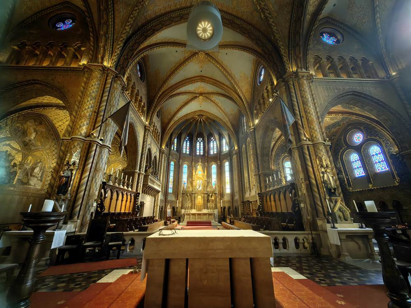 马加什教堂原本是布达圣母教会,后因匈牙利国王马加什在此举行婚礼而改名,也是匈牙利国王加冕之处。但是通常以国王马加什一世的名字 称为马加什教堂。图为马加什教堂的内观。