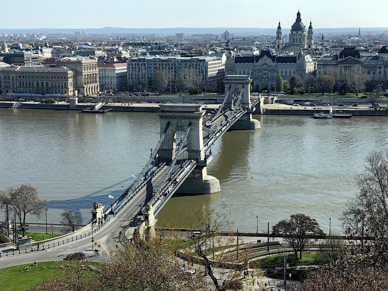在布达山的高处, 俯瞰建成于1849年的塞切尼链桥, 它也是连接两岸的9座桥梁中最古老的一座。