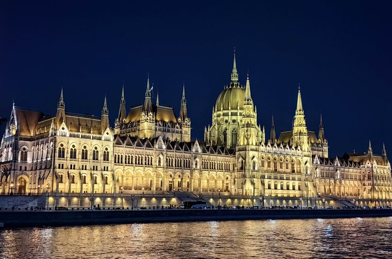 多瑙河左岸的匈牙利国会大厦是布达佩斯最壮观的地标,这座具有典型新哥特式风格的建筑建于20世纪初,是匈牙利最宏伟、最华丽的建筑之一,同时也是欧洲大陆最大的国会大厦。图为华灯初上的国会大厦。