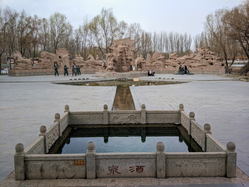 霍将军征匈奴、河西大捷,得到武帝褒奖的史实,在古泉北侧的大型雕塑得到了充分体现。它流光溢彩,气度不凡,群雕“出征”、“鏖战”、“庆功”三组场景,准确而艺术地再现了霍将军河西大捷的历史功绩和酒泉的来历。李白乐府诗《无胡人》写道:“严风吹霜海草凋,筋干精坚玥马骄,汉家战士三十万,将军兼领霍嫖姚,流星白羽腰间拽,创花秋莲光出匣,天兵照雪下玉关,虎剑如沙射金甲,云龙风虎尽交回,太白入月放可催。”吟诵了霍将军带领将士出击匈奴的威武场面和可歌可泣的英雄事迹。