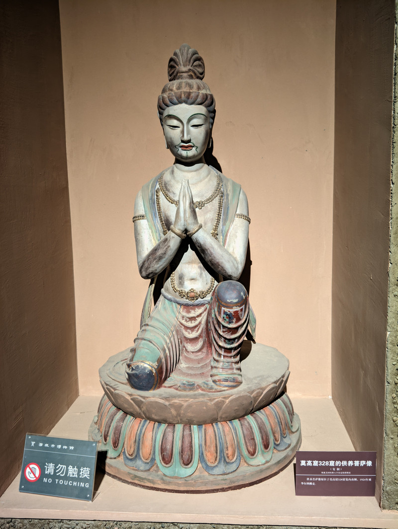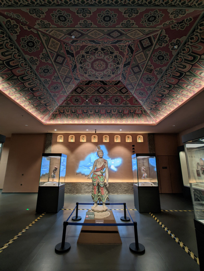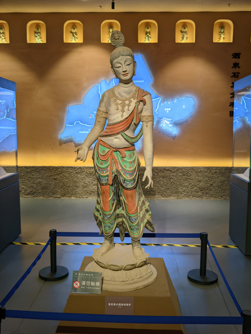 入口处有莫高窟45窟胁侍菩萨的复制品,尽情展现出属于盛唐的华丽。这座菩萨像面部圆润,线条柔和,身姿曼妙,正是唐代以丰腴为美审美观念的表达。