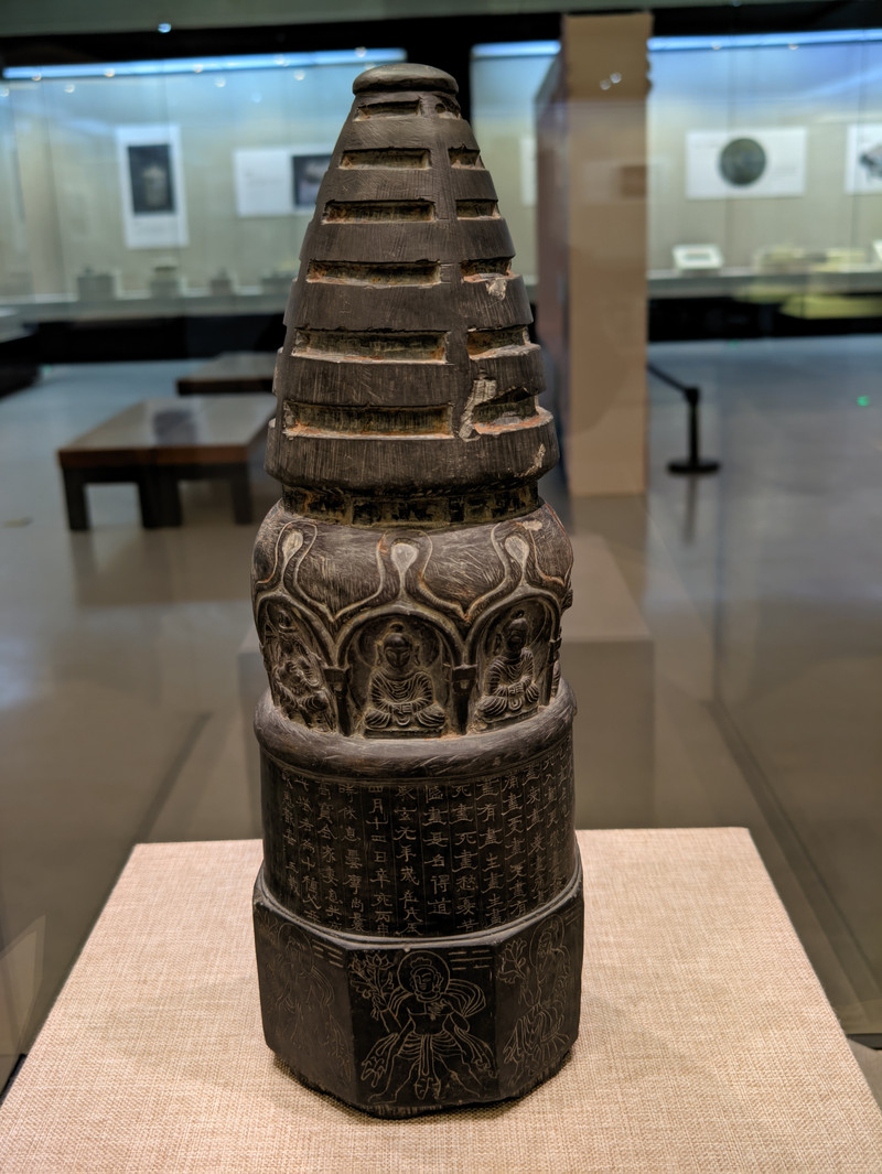 圆柱形塔腹上阴刻《增一阿含经》中《结禁品》中的部分经文和发愿文,上题“高善穆为父母报恩立此释迦文尼得道塔”。经文后刻有“ 承玄元年岁在戊辰四月十四日辛亥丙申时休息昙摩高宝合家妻共成此塔, 各为十种父母报恩欢喜五义”。北凉承玄元年为北魏太武帝神嘉元年, 即公元429年。这一明确的纪年便使之成为了我国最早的佛塔珍贵实物之一。