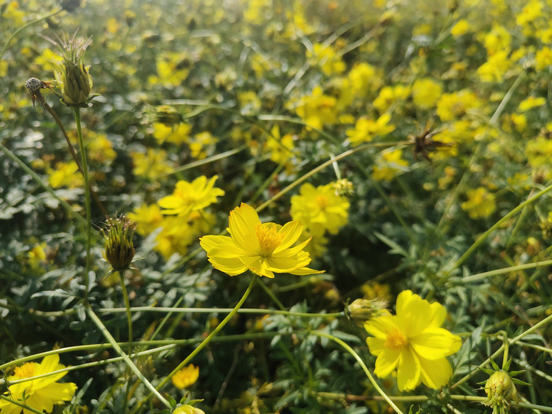 - 硫华菊:无疑是花田中的佼佼者。它们黄得绚烂,仿佛为大地铺上了一层金色的地毯。硫华菊与波斯菊同属菊科,但更显“健壮”,且花色专一,只有黄色,又名黄秋英。其花期长,从盛夏到深秋,无惧风雨,始终绽放出最热烈的色彩。