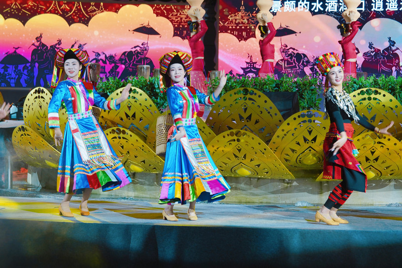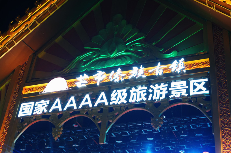 古镇的红灯笼高悬于街道两侧,夜幕降临时,暖橘色灯光将青石板路与尖顶傣式建筑映衬得金碧辉煌,呈现出「古建筑与现代光影交织」的梦幻氛围。