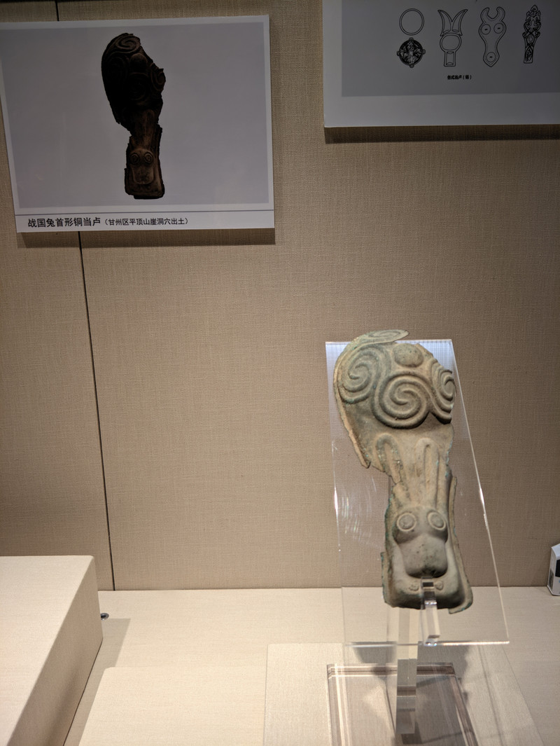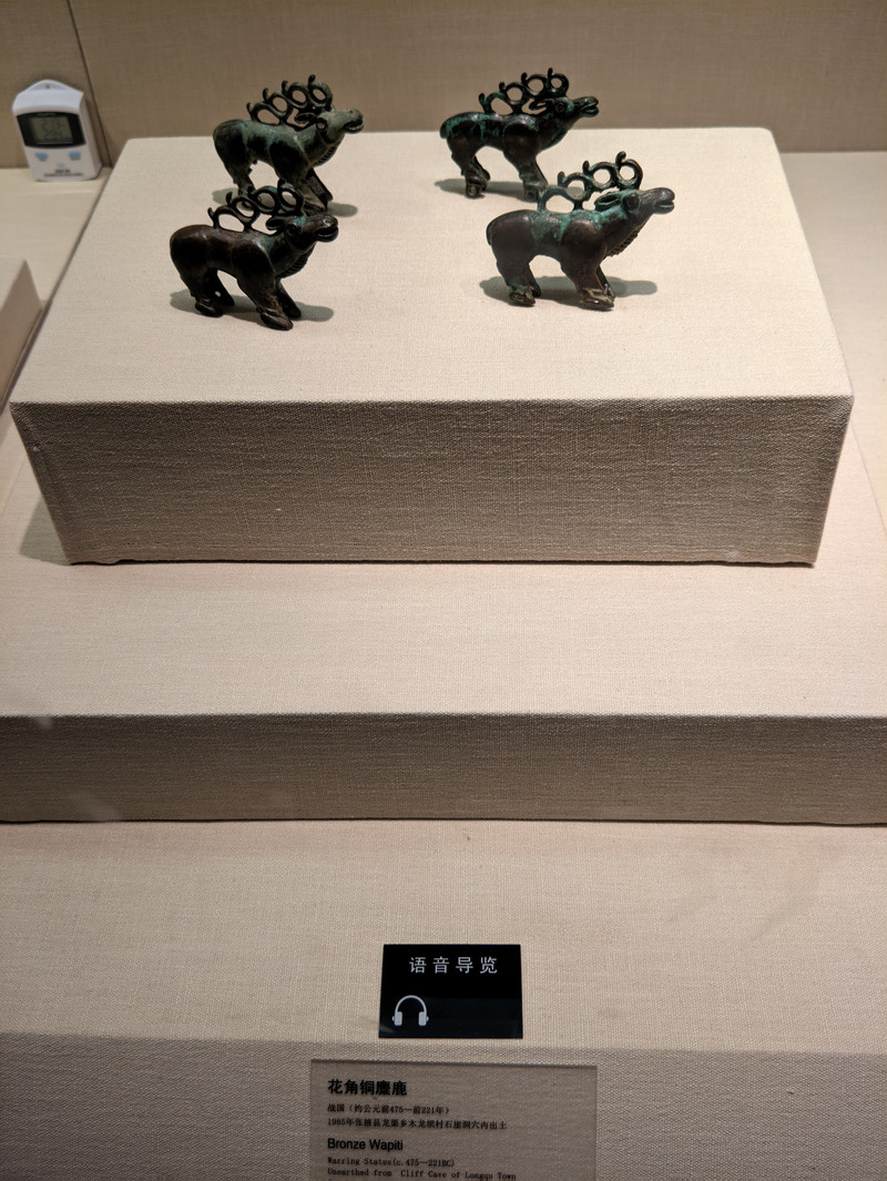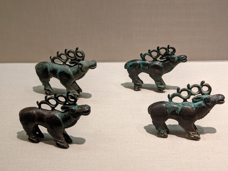 西汉之前,河西走廊一直是游牧民族驰骋的地方,其中心腹地张掖是汉民族与北方少数民族的交融地,乌孙、月氏两族在这里杂居,来来往往的历史在这里烙下了厚重的遗迹。博物馆镇馆之宝正是战国时月氏族的花角铜麋鹿,也就是我们所说的四不像。构思巧妙、风格独特、造型优美、姿态飘逸、栩栩如生,国家一级文物。
