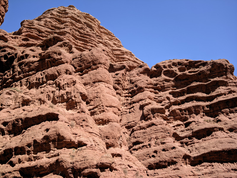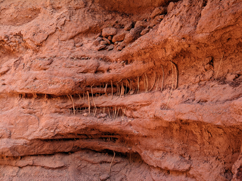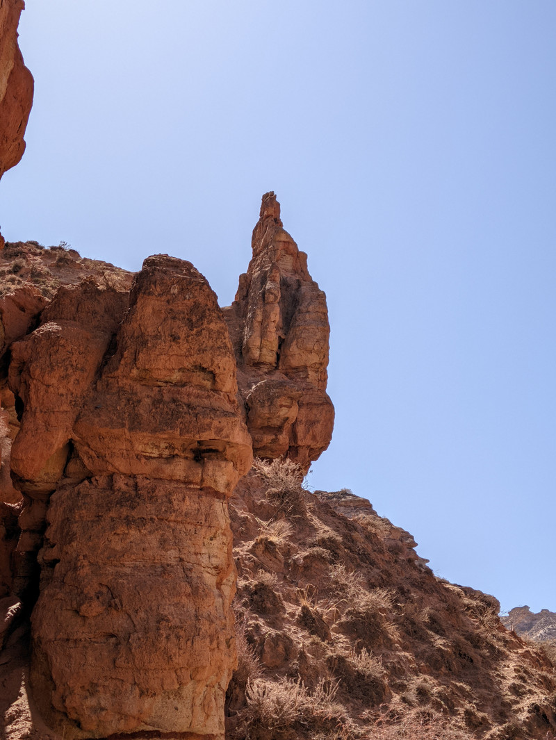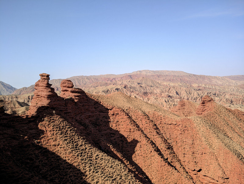 峡谷内,沟壑纵横交错,山形走势舒缓,以红白与赭红为主色调,色彩虽略显苍凉,却呈现出一种震撼人心的悲壮之美。突兀挺拔的石柱、纵横交错的深沟、赭红色的层层叠叠的山丘……