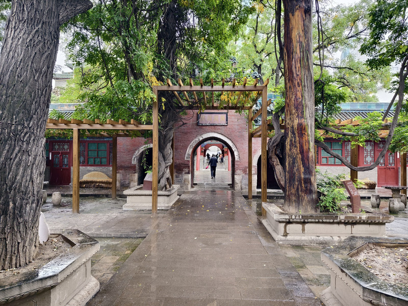 穿过“道德之门”进入第二院,门两侧有明代著名道人孙一元撰书的石刻楹联。二进院门背墙上方刻有“蓬壶佳瑞”九叠篆文。二进院内,古木参天,枝繁叶茂。
