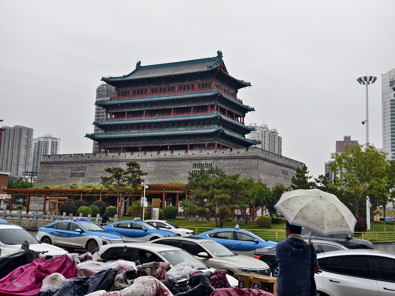 看完双塔向外走,开始下雨了,天冷变成了雪粒,感觉挺冷的。11点半打车去五一广场。 下雨,没有去五一广场看看,从背面拍了首义门。