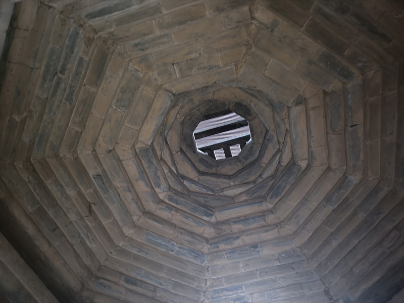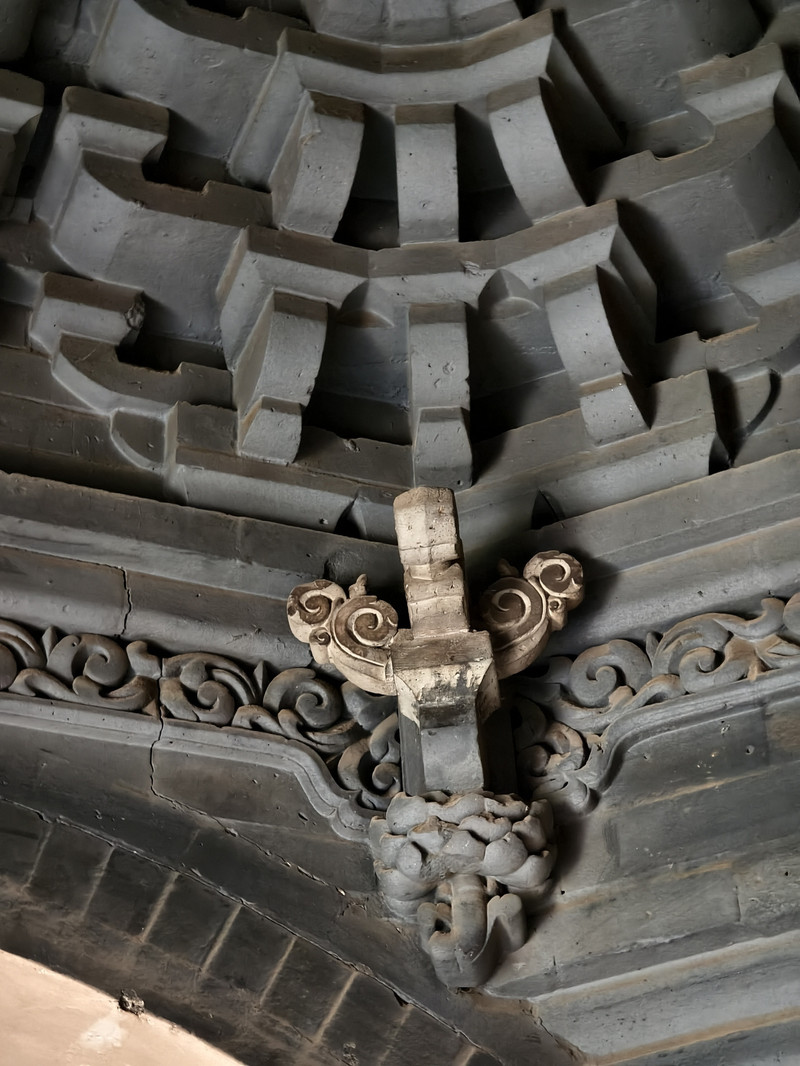 第四进院的门是“虚无洞”,砖券拱门正上方刻有“虚无洞”,其上有“别有洞天”四字,洞上楼檐下悬“瀛洲妙境”匾额。纯阳宫内殿堂总计七十余间,建筑最精华的部分当属第四进院的九宫八卦院。