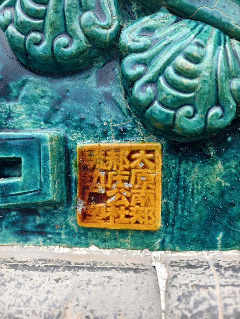 这是大门右侧琉璃雕塑的制作单位,也有历史了。