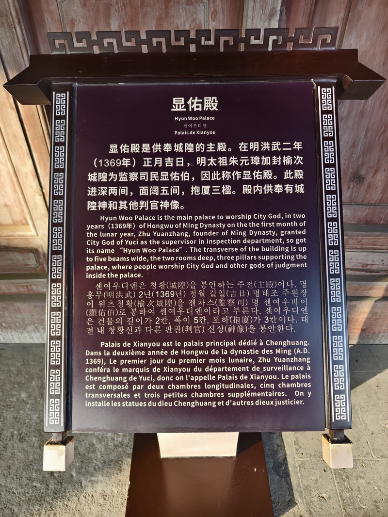 榆次城隍庙是我国目前最古老,保存最完整的城隍庙之一。始建于元至正二十二年(1362年),坐北朝南, 中轴线由南往北依次为山门、玄鉴楼(兼作乐楼、戏台)、显佑殿、寝殿,两侧为钟鼓楼、东西廊房、东西配殿等。现存显佑殿为元代遗构,山门、玄鉴楼为明代重修,其他都是清代建筑 。第四批全国重点文物保护单位。