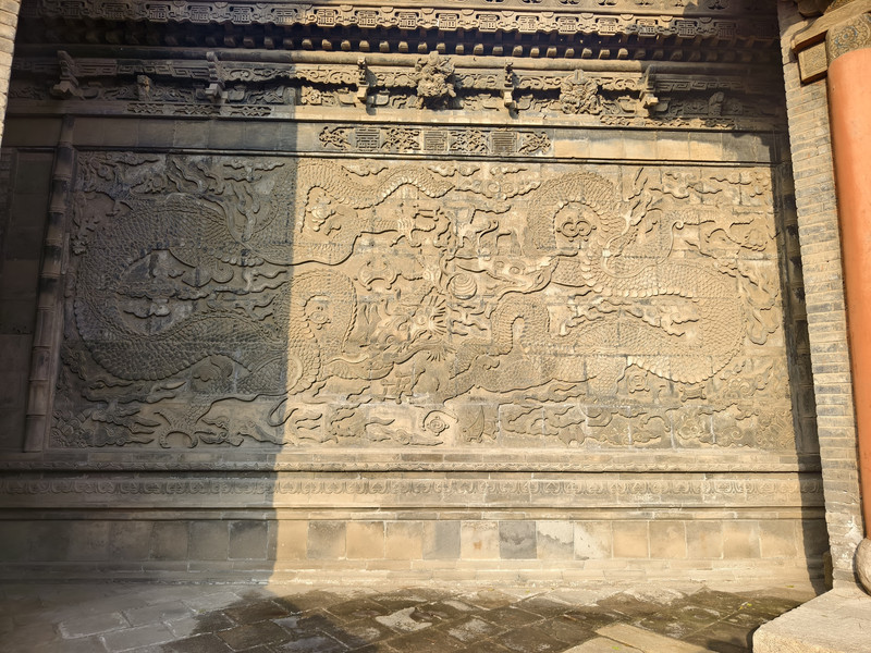 二龙戏珠影壁,建于明成化12年(1476年),由102块方砖组成。