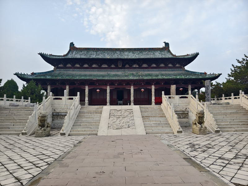 寝殿建于明弘治7年(1494年),寝殿雨东西配殿由八字砖雕二龙戏珠影壁相连。
