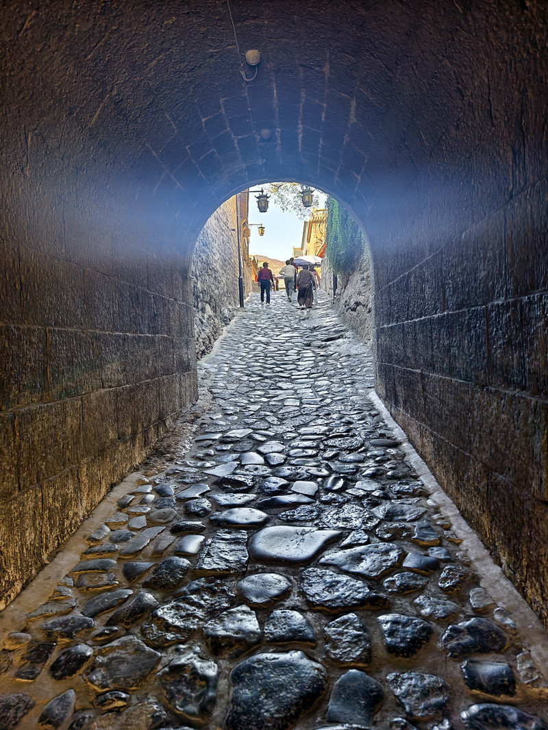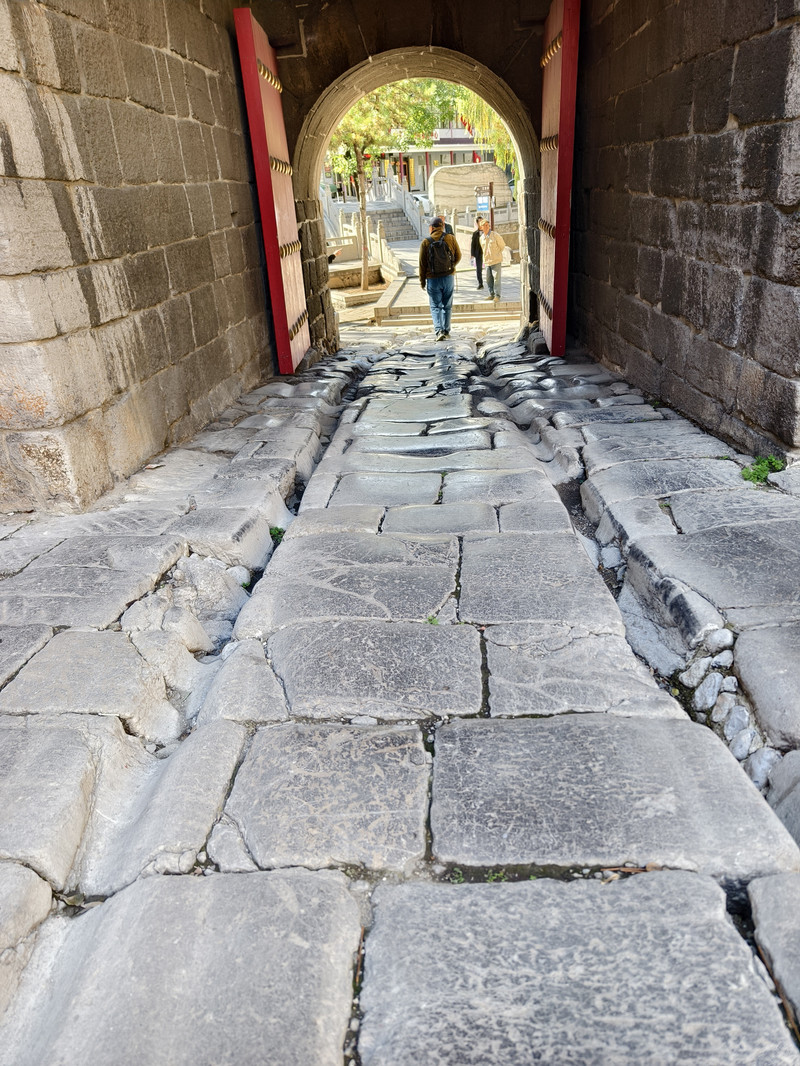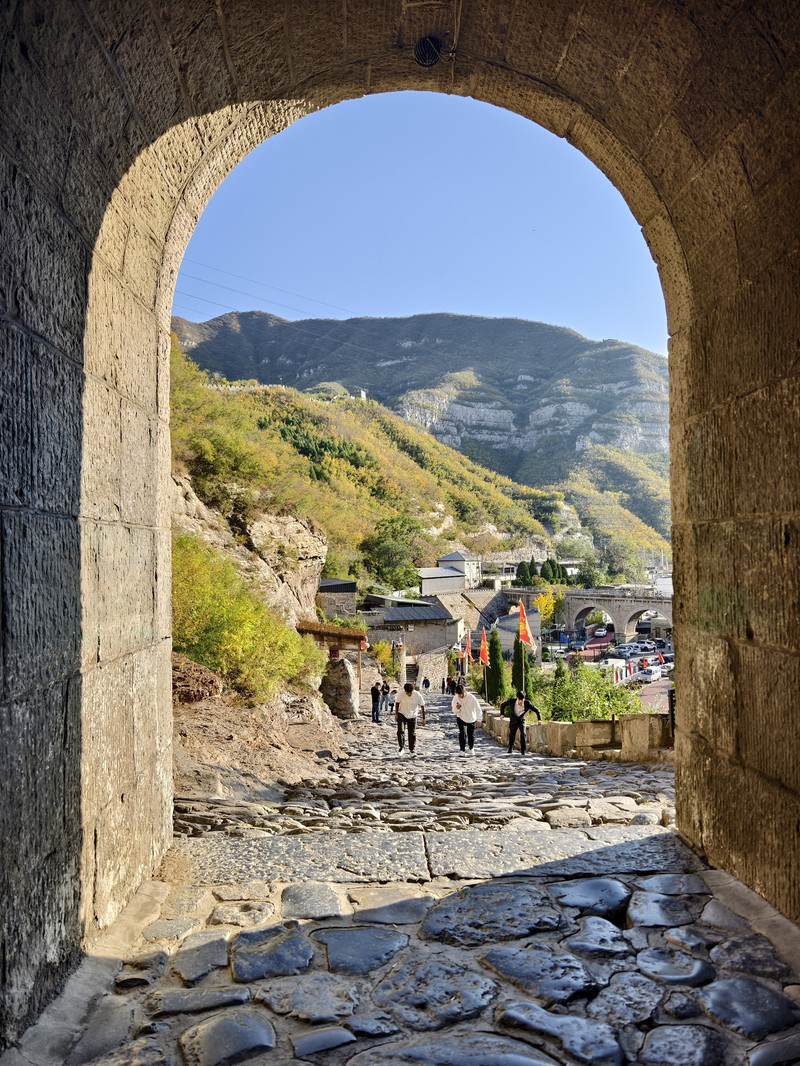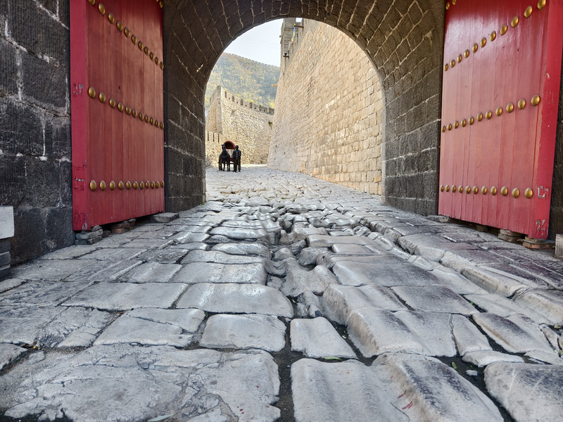 门洞前保留近百米石铺古车马道,为明清时期交通要道的遗迹。