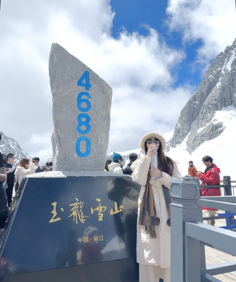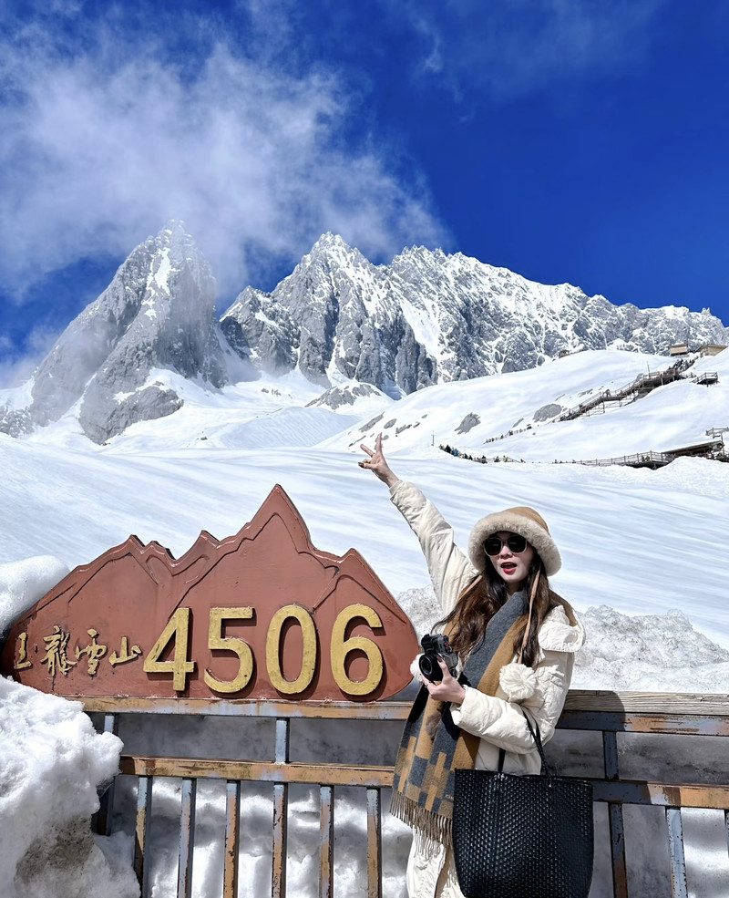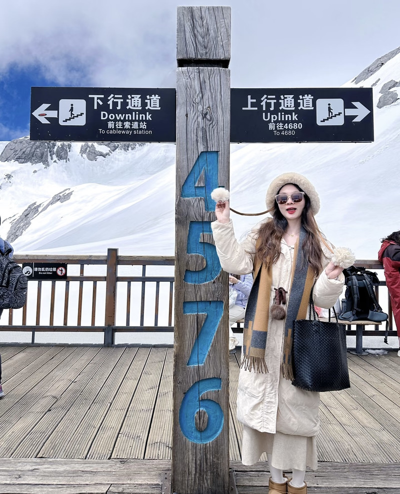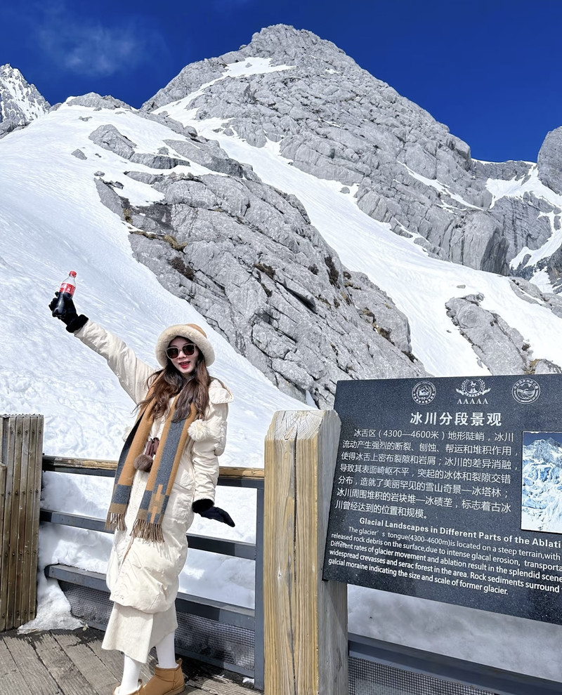 登顶玉龙雪山是个难忘的体验,大索道坐到4506米,自己慢爬至4680米。这一路光是排队坐缆车上下山就很耗时,下了索道到雪山,虽然有些冷,但因为大太阳晒着,加上爬楼梯,还是挺热的。原本以为自己没有高原反应,不怎么需要吸氧,一路上活蹦乱跳,还热情帮其他游客拍照。