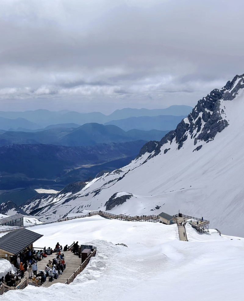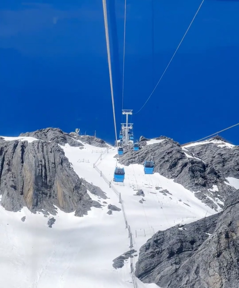 下了索道到雪山是一种类似进冰窖的冷但因为大太阳晒着加上爬楼梯是挺热的