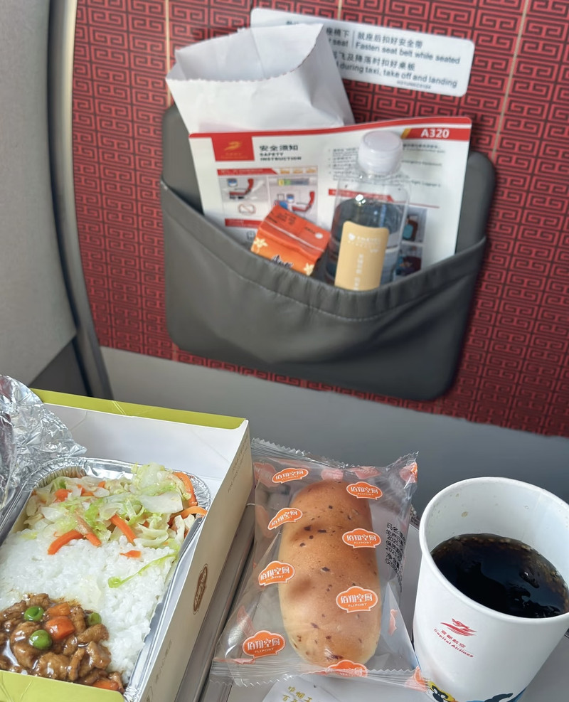 乘坐首都航空JD5650从厦门直飞丽江,整个飞行时长约3小时。实际起飞时间为11:44,落地时间为14:42。原本以为作为廉价航空,没有行李额是常态,因此选择了超级经济舱(也没有商务舱可选)。令人惊喜的是,尽管是廉航,但超级经济舱却提供了热食配餐,这让我这个特地提前去休息室啃泡面的打工人感到十分意外和满足。在连续工作了六天之后,身体虽然憔悴,但食欲却异常旺盛,连平时不屑的鸡肉饭都干得一干二净,身体状态瞬间切换到旅游模式,真是给力!