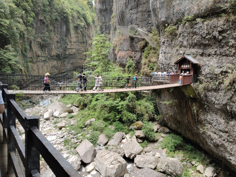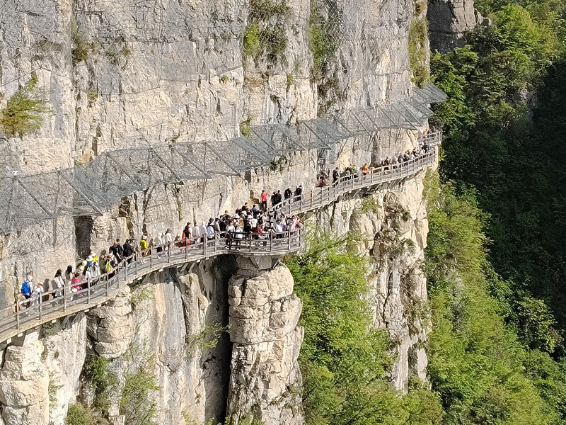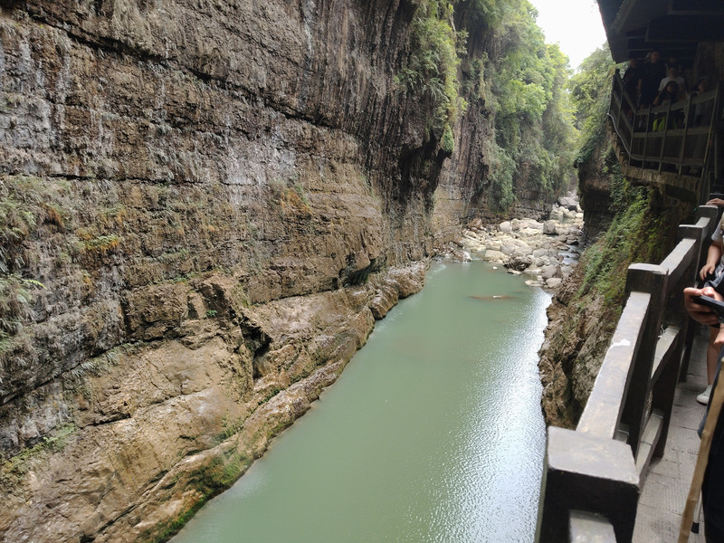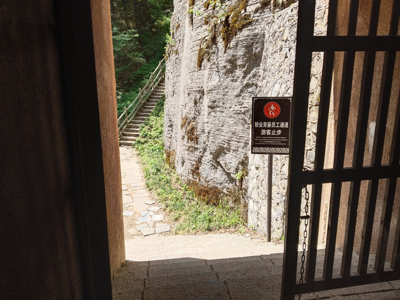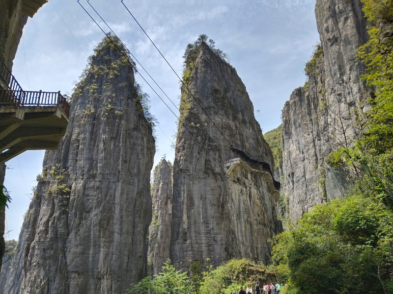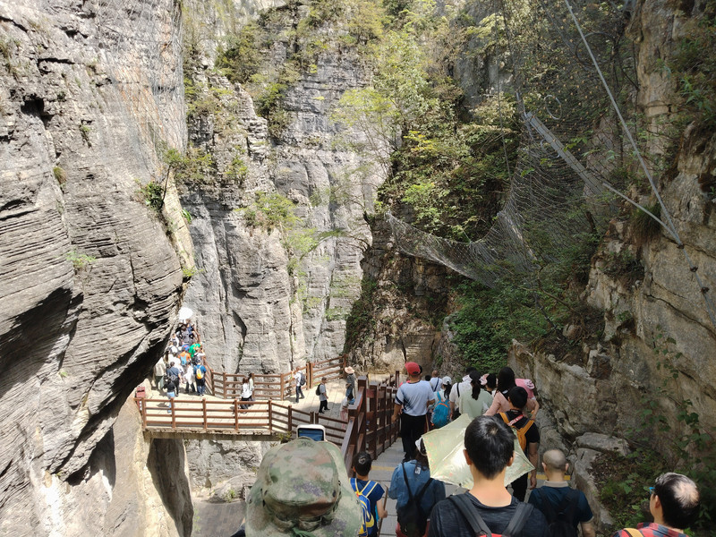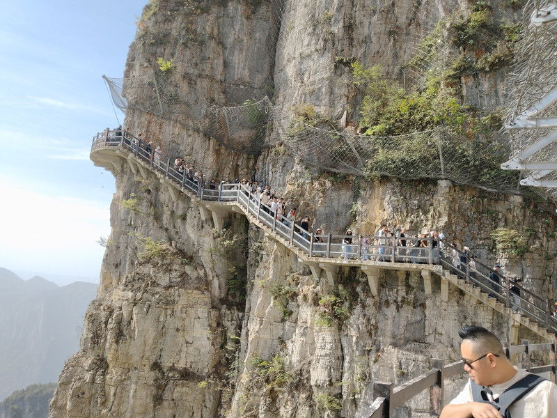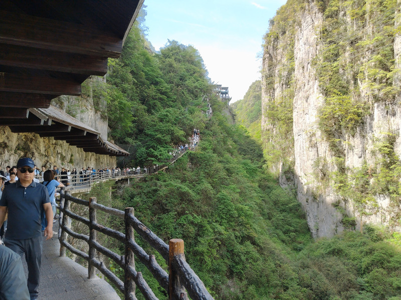 穿过一线天,到了绝壁长廊。又称绝壁栈道,全长488米。118个台阶,海拔1700米。这条栈道和去年在湘西州吉首的矮寨景区走的差不多,不过比矮寨的要宽。往下看风景也几乎一样。