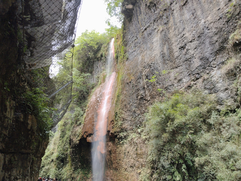 五彩黄龙瀑布。经过冲刷的石壁变成了红橙色。因为石壁的石头里含有大量的铁元素。