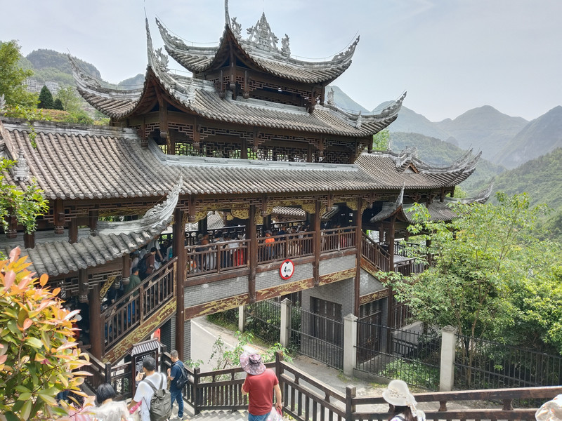 回到游客中心停车场。出发!去重庆奉节。出大峡谷停车场三岔路口左转是去奉节方向。安来高速的恩施到奉节段还没通车。只能走G242国道。这段国道由湖北的(屯渝线公路)和重庆的巫恩线公路组成。是中国最美的十大自驾公路之一。左转后就是沐抚古村。古村上挺热闹的,都是民宿,餐馆。靠着开发大峡谷旅游,这里也发展起来了。