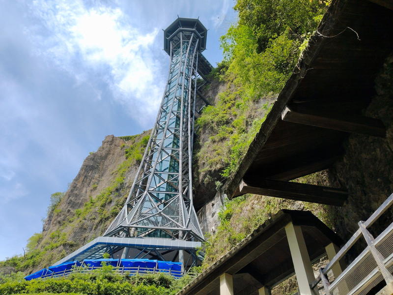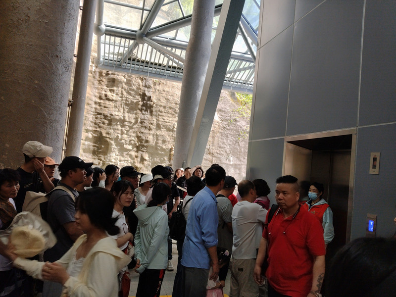 终于到电梯了。这个垂直电梯外形有点像小蛮腰广州塔。不坐电梯要从旁边爬999的台阶。