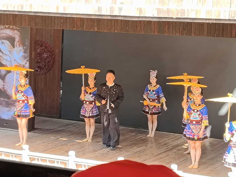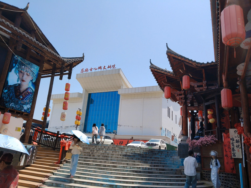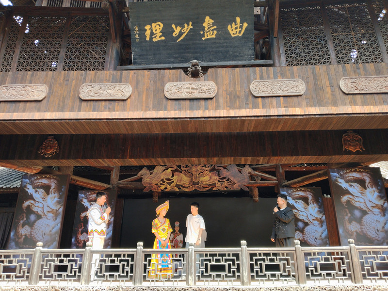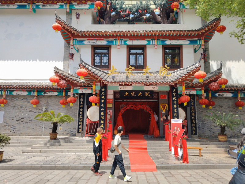 九进堂是依山而建的,每一进都要上一层。二进是看戏的地方。戏台对面的楼阁,是土司老爷看戏时的座位。要比旁边楼阁高一点,显示出了土司老爷高人一等的地位。这里穿着土家族苗族服饰拍照的游客特别多。