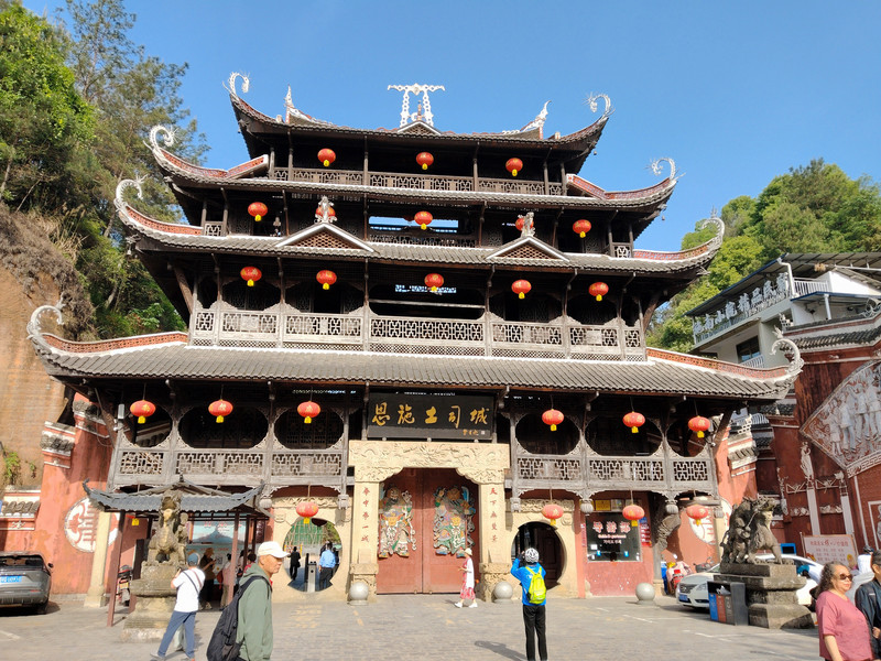 恩施市区不大。坐公交车去土司城。开车只能到土司城的南门停车场。然后再坐摆渡车到景区东门。还不如坐公交车过去方便。土司城站下车就是景区的正门(东门)。门楼气派的。恩施土司城号称湖北的故宫。是整个土家族地区最大的土司衙门。不过看上去,比前年在丽江古城参观的号称云南故宫的木府要小了很多。