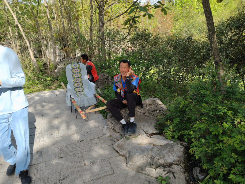 不少抬滑竿的当地土家族山民在招揽生意。根据路程计费,全程从索道口到一炷香900块。还有女人用竹篓背小孩是300块。前提是只能四五岁的小孩,再大了竹篓里装不下。如果太胖了要加钱。