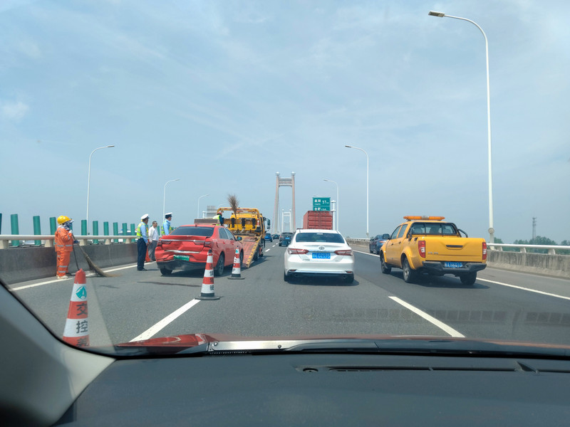 马鞍山长江大桥上有事故,开始缓行了。还好一会就过去了。