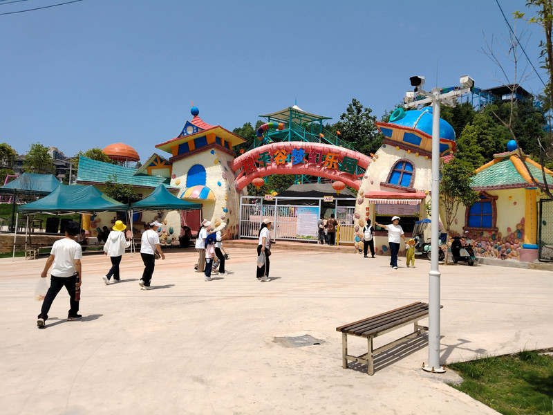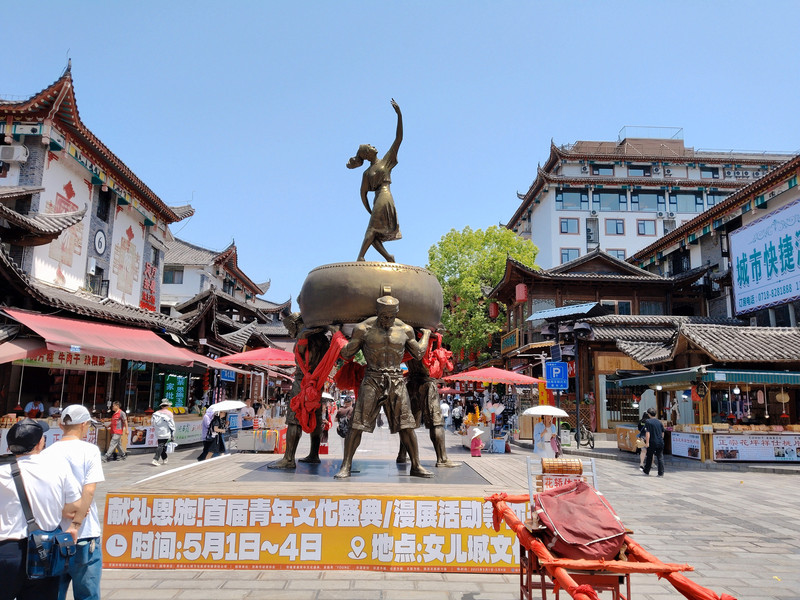 土司城游玩结束,坐公交去女儿城吃午饭。还是回到土司城东门的公交站台,坐39B到女儿城下车。结果下车后要到对面去,路中间有隔离带。只能往前走不少路,过了斑马线到对面。问了一位大哥,他说从小路穿过去就是女儿城。其实应该提前一站在华硒生态园二号站下车,穿过斑马线就是女儿城广场正门。