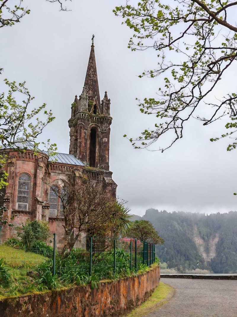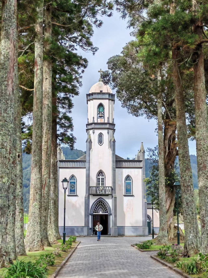 大路的拐弯处,有一幢教堂迎风而立。斑驳的外墙,似乎诉说着经年的风霜。这个教堂真让我想起那年去葡萄牙辛特拉的雷加莱拉庄园,里面颇具浪漫主义的雷加莱拉宫。有一个值得拍成电影的美丽的爱情故事:一个男人为了治愈他的妻子,在富尔纳斯的这个湖边上建造了一座教堂,他们的房子周围还有一个花园。外表看上去像是哥特式,尖耸的屋顶,外面斑驳的墙壁用细致的玄武岩和当地凝灰岩建造而成,就像历尽过野火的洗礼,只是静静矗立在那里,就有种神秘的故事感。