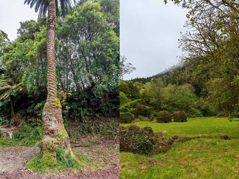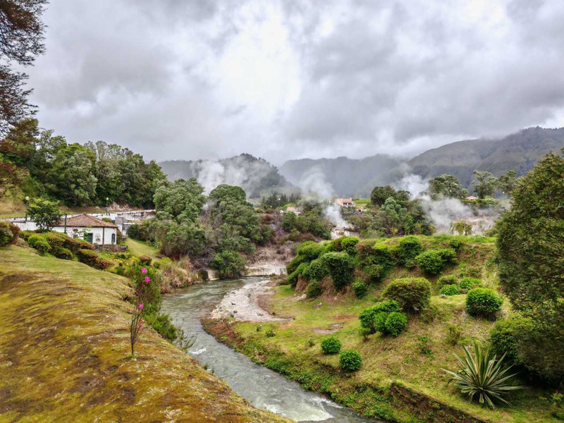 这里也是亚速尔群岛享有盛名的温泉理疗度假地。据说旺季人们都争先恐后来这里泡温泉理疗。确实, 这里地处内陆,四周环绕的群山像一道屏风阻挡了海风的肆虐,给植物带来温和的生长条件。整个小镇就如一个美丽的大花园,到处树木茂盛、繁华似锦。几处温泉点缀在花园之中,袅袅升起的水汽再大的雨水也没把它浇灭。(捂脸小蜂)是的,又下雨啦。而且是大雨,那种瞬间就能让你成为落汤鸡的大雨。