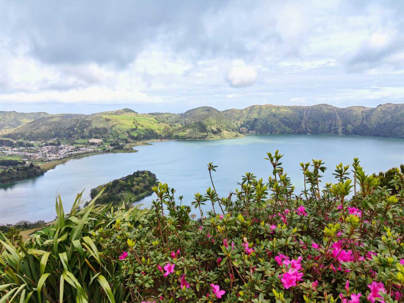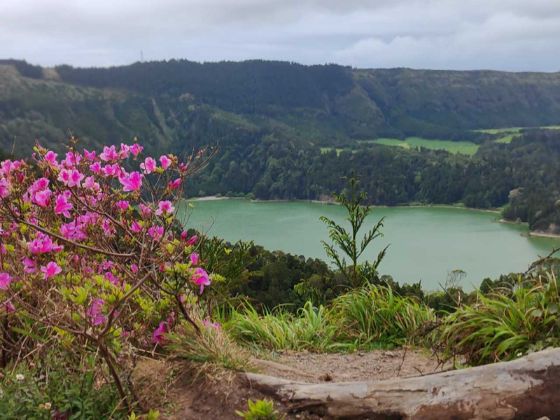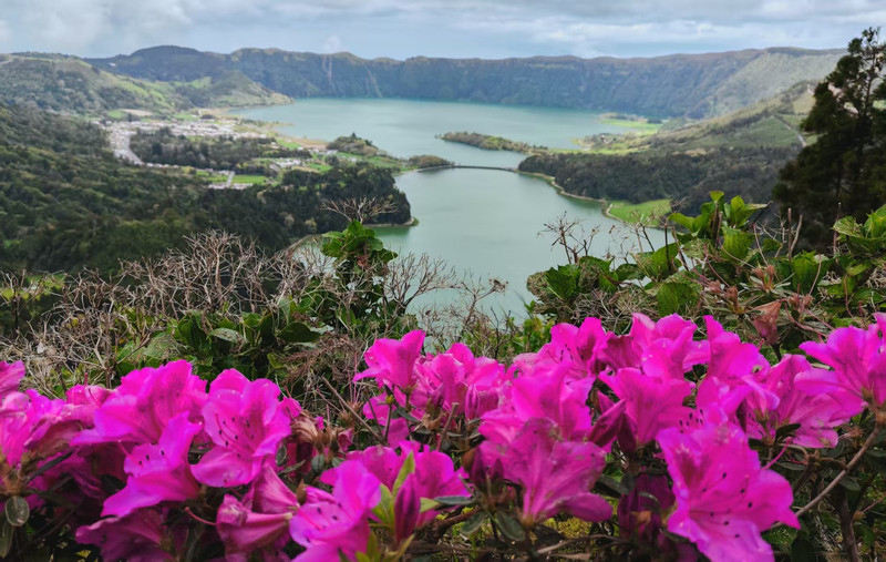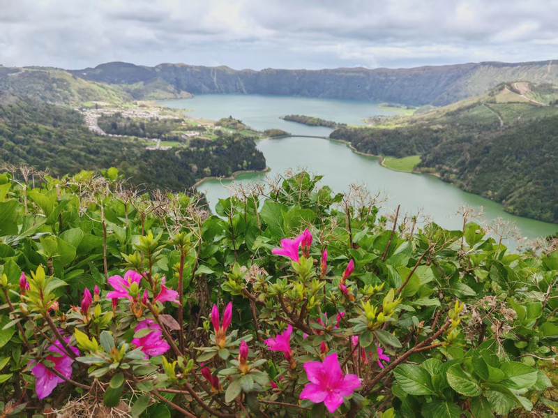 开车又往山上走,上面有个七城最著名的“国王观景台”(Miradouro da Vista do Rei)。车到目的地,瞬间被眼前这蓝绿两色的火山湖所吸引。火山,湖泊,大海,蓝天,组成一副壮观的美景,没什么人,我们可以安静地多呆一会,山风隐隐蓄势,吹起坡上的植被如大海破浪层层翻滚,山上的野杜鹃成为最好的衬托,虽然没有强烈的阳光穿透云层,但是有了这抹红色,拍出的照片也足以震撼。