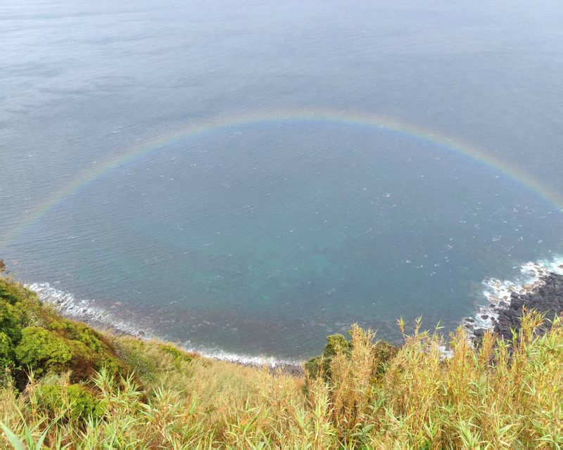 正当我们准备寻觅那条往下走向海边的小道时,天边云开雾散,阳光洒下来了。此时,我看到了彩虹,心情激动不已。我们一路蹦跳着下坡,感受着大自然的美丽与神秘。