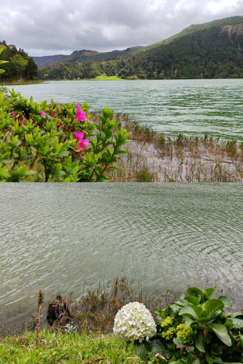 双子湖:火山口形成的蓝绿双色湖,夏季湖畔绣球花盛开,观景台(Vista do Rei)可俯瞰全景。