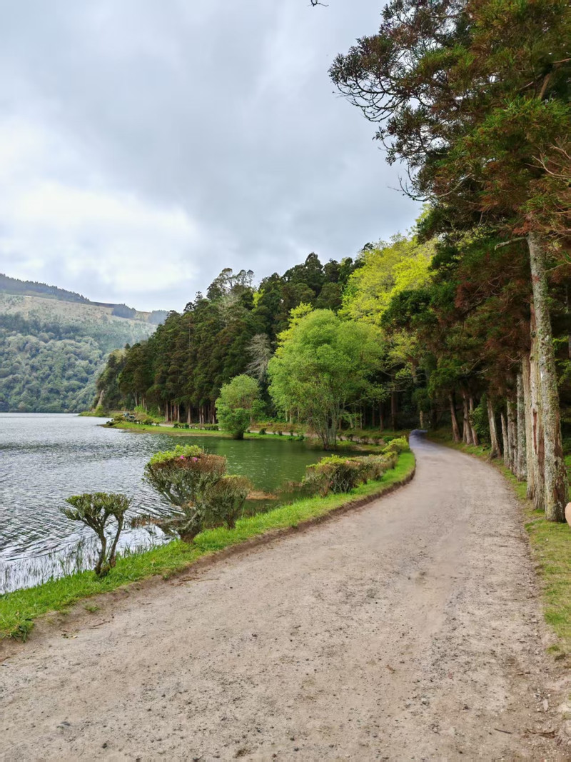 路过一片平旷的牧场,通往郊野的林荫道边,和七城湖(Lagoa das Sete Cidades)不期而遇。这里人烟稀少,要不是看介绍是著名的七城湖,真以为是一个荒野山脚下的野湖呢。停车在湖的一侧,我们开始沿着人迹稀罕的林中小径向前,一汪幽幽深潭在面前展开,有种独享大自然的快乐。