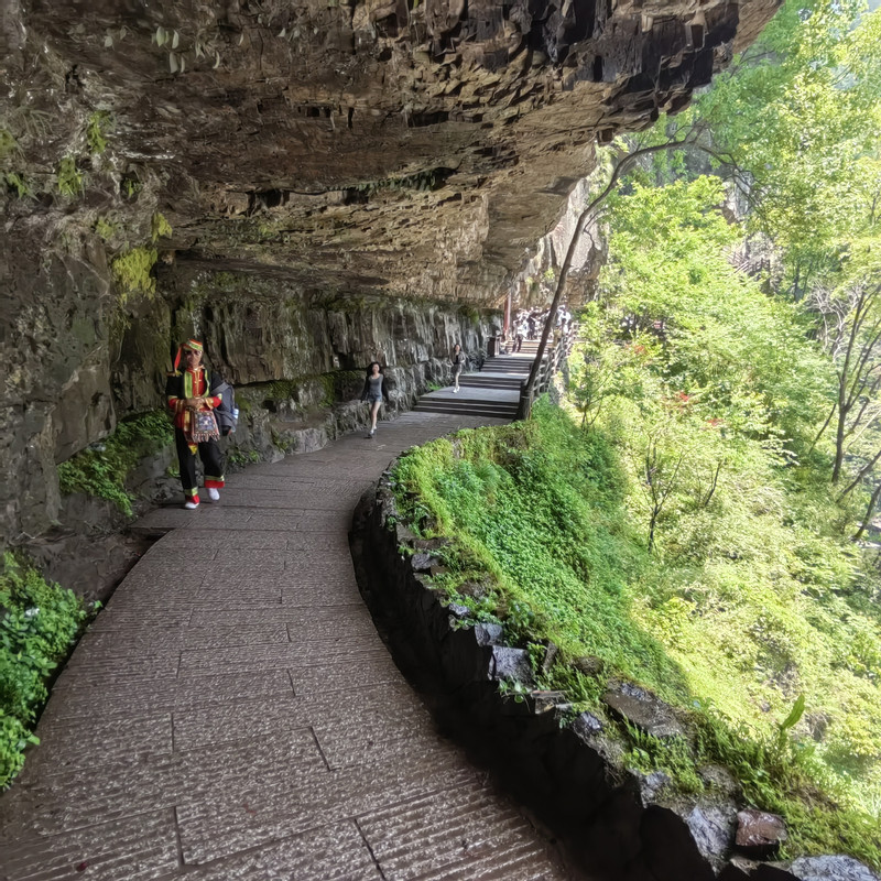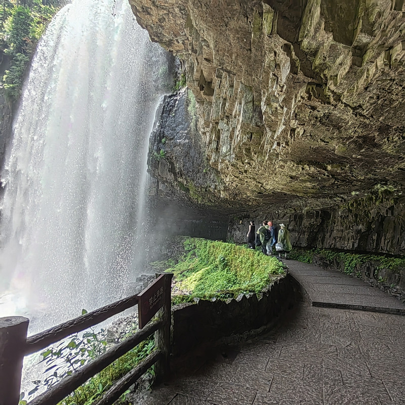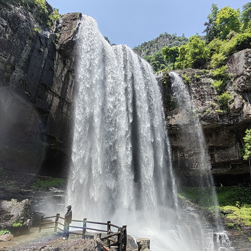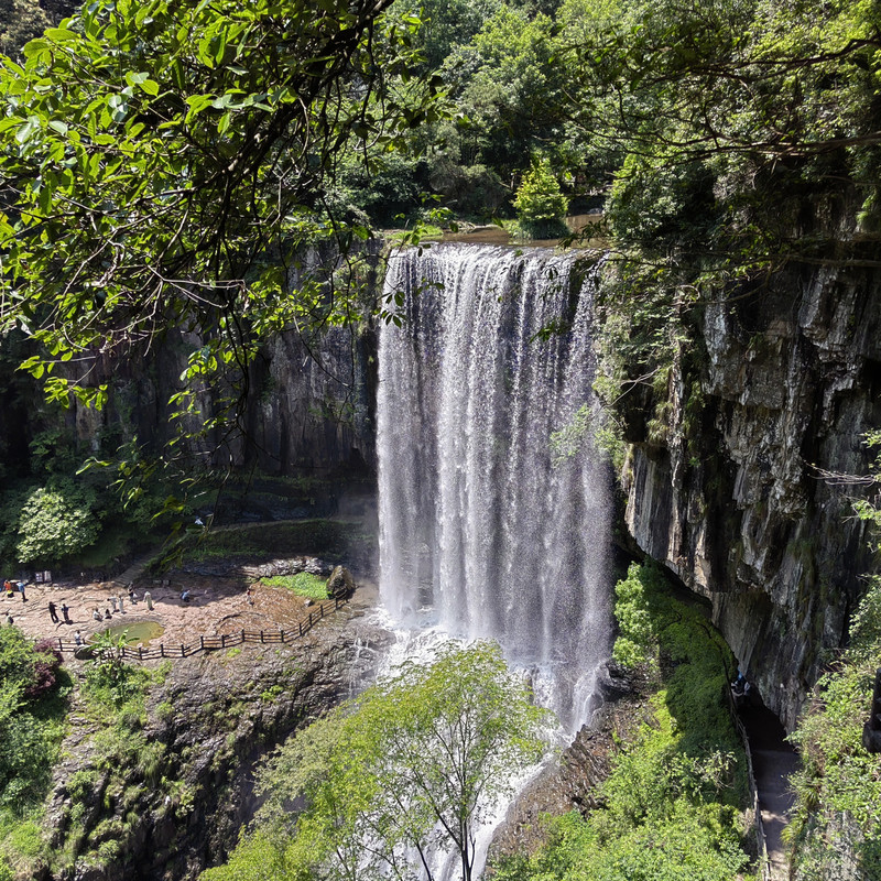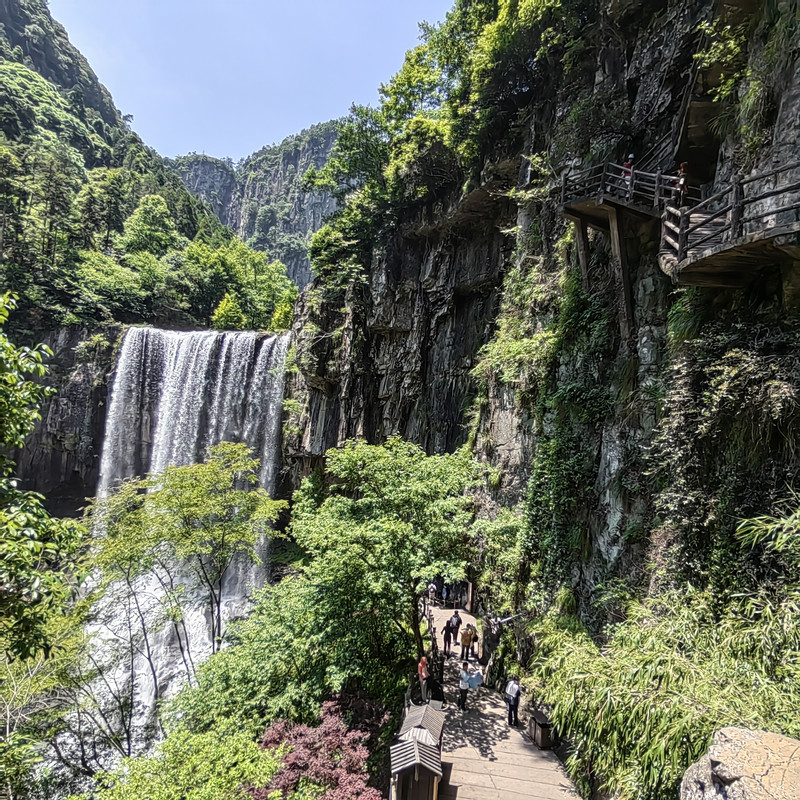 二漈是百丈漈的一大亮点,其高达68米,宽50米多的瀑布分为上下两折,展现了大自然的鬼斧神工。上折高25米,瀑布后隐藏着一个天然通道,形似月牙,口高2.6米,凹处深达8米左右,长达40余米,末端则又延伸出80多米。这样的自然景观,让人不禁感叹大自然的神奇与美妙。