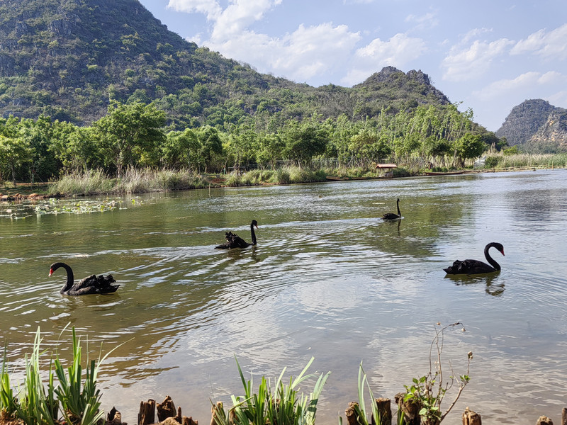 - 景区游玩:普者黑以其喀斯特岩溶地貌、4万亩野生荷花、湖泊相连峰林以及孤峰星罗棋布而著称。我选择了画舫游船套票,上午在山水间穿行,感受大自然的鬼斧神工。虽然还不是荷花盛开的季节,但游船所经之处的水体清澈透明,让人心旷神怡。下午,我徒步天鹅湖景区,轻松完成了2万步的目标。湿地处的绿野仙踪感觉让人陶醉,而一群天鹅的出现更是为这次徒步增添了生机。