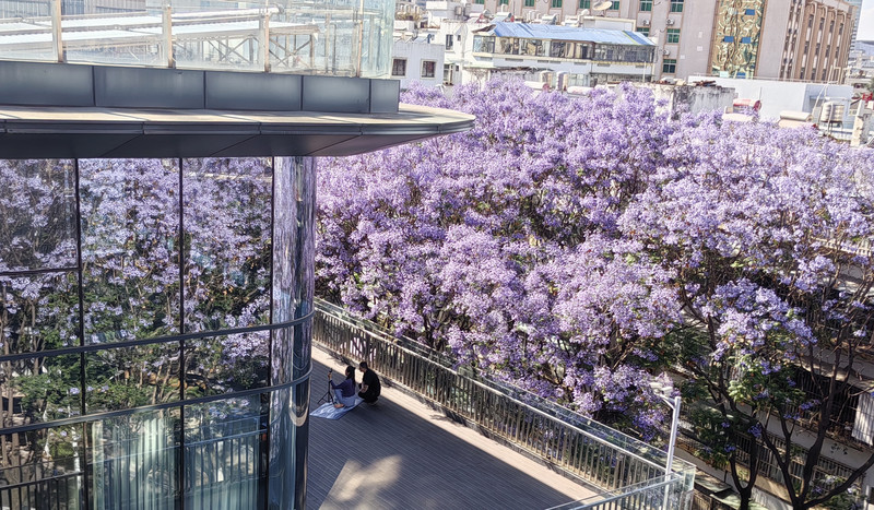 5月的昆明,蓝花楹已经盛开,一下飞机安顿好我就打车到铁皮巷的彩云里。其实昆明的快速路大街小巷和周边的城市,蓝花楹随处可见,铁皮巷的蓝花楹可能树龄长,盛开的时候还是比较壮观,街区也比较有文艺气息,挺多咖啡馆都外摆座凳,咖啡香与满眼的蓝紫色花影,很搭。