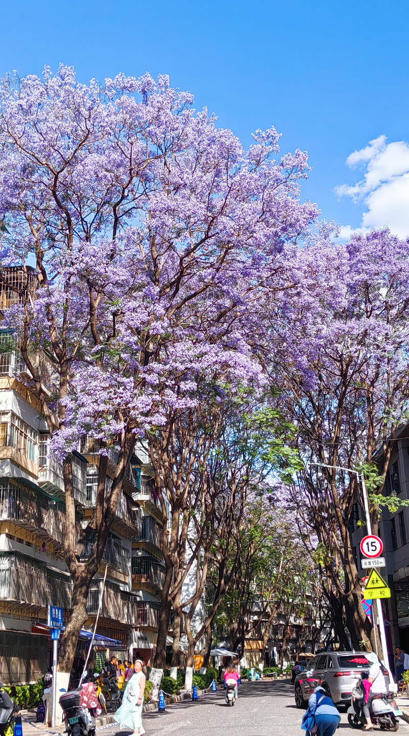 5月的昆明,蓝花楹已经盛开,整个城市仿佛被紫色的花海所包围。我抵达后,直接前往了铁皮巷的彩云里,那里的蓝花楹树龄长,盛开时极为壮观,街区也充满了文艺气息。咖啡馆的外摆座凳与满眼的蓝紫色花影相得益彰,让人沉醉其中。